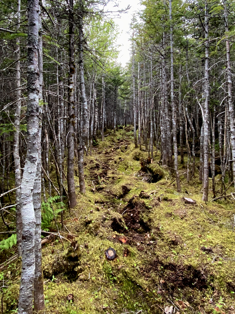 Though constructed and used by hunters and cabin owners to access remote areas south of Gros Morne National Park, Mogul ATV Road provides good access to the Elephant Trail trailhead, though during rainy intervals in summer and the fall hunting season when temperatures are lower, sections of the gravel road can be muddy. After 3.3km (2mi) a small sign on the right side of the road marks the beginning of the Elephant Trail.